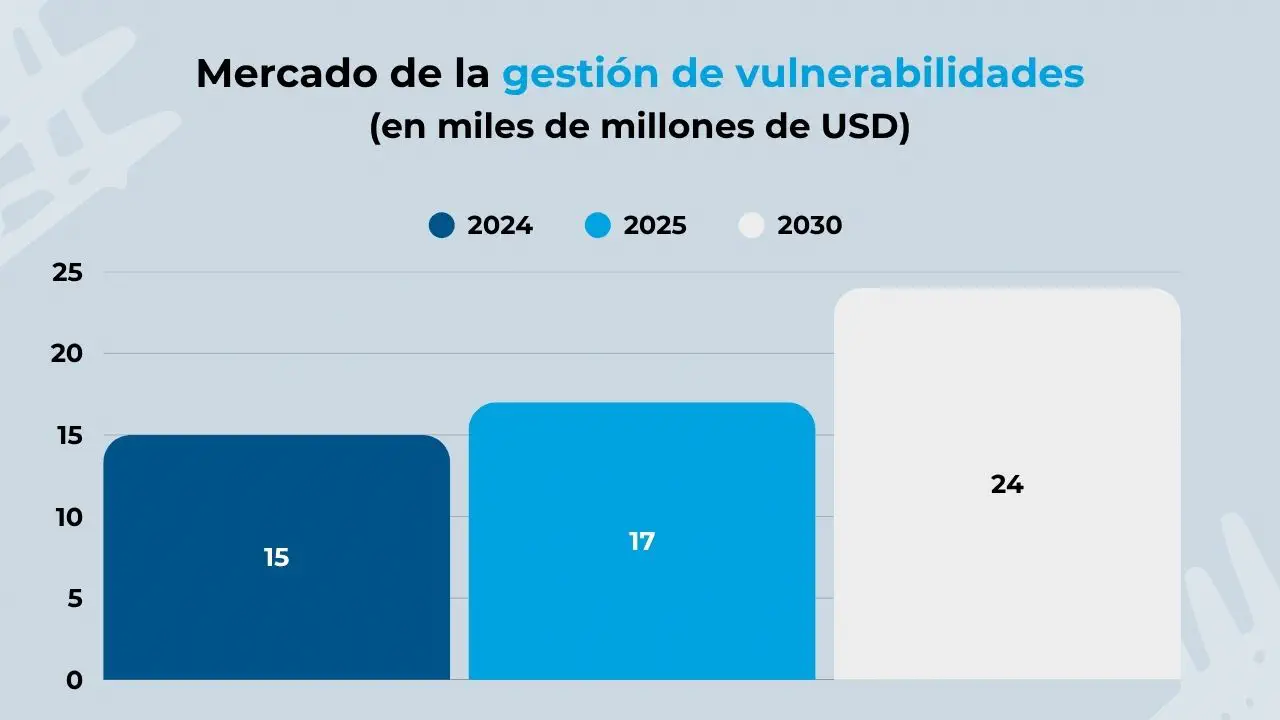 Estos datos concuerdan con el estudio realizado por MordorIntelligence, en el cual se estima que el mercado de la gestión de vulnerabilidades llegue a los 17.24 billones de dólares a finales de este 2025 y alcance los 23.5 en el 2030. En este caso, se calcula una tasa de crecimiento del 7.5 CAGR.