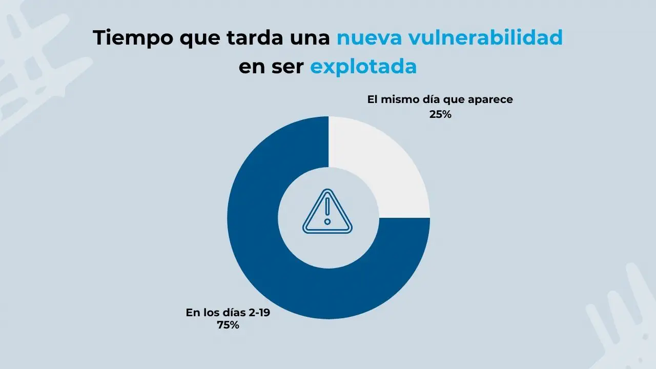 Los puntos anteriores nos dejan un claro mensaje: es de vital importancia para una empresa actuar lo más rápido posible ante cualquier vulnerabilidad. Un reciente estudio hecho por Turfin subraya este hecho, señalando que 1 de cada 4 es explotada durante el mismo día en que aparece y el 75% restante durante los primeros 19 días.